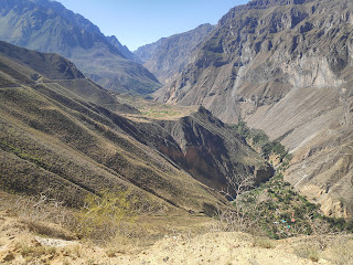 Le paysage est un peu rébarbatif en cette première journée, bien qu'on apprécie la grandeur de ce canyon. Au détour d'un des premiers virages, on peut apercevoir en un coup d'œil l'ensemble de notre trek, avec d'un côté, au bord de la rivière, le village de Llahuar (lieu de notre première nuit), et de l'autre l'oasis de Sangalle (notre deuxième nuit).